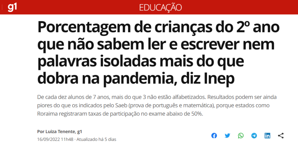 Em pesquisa divulgada pelo Inep, dados apontam que o impacto da pandemia no processo de alfabetização atingiu mais de 30% das crianças com idade próxima a 7 anos. Isso significa que crianças que já deveriam estar lendo e escrevendo, ainda não estão.